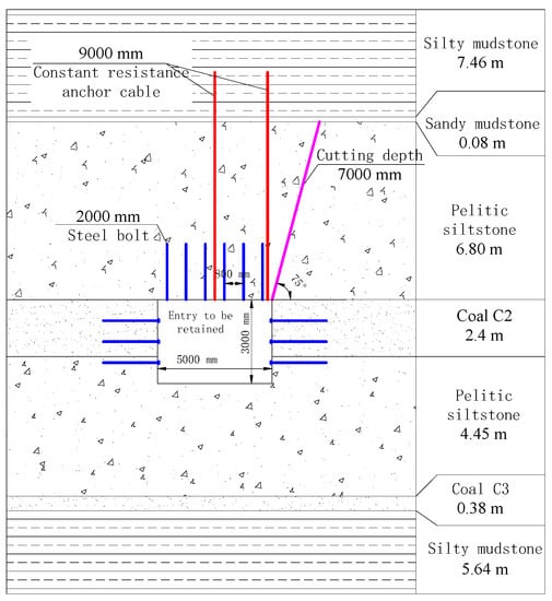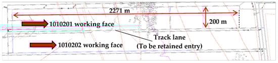 The 1010201 working face is the first working face of the Yuwang No.1 Coal Mine and is also the first back-mining face of the Huaneng Diandong Mine Area. The working face has an elevation of +1535.7~+1254.4 m, corresponding to a surface elevation of +1690~2000 m, and a burial depth of 500~550 m. It belongs to the C2 coal seam, which is the uppermost recoverable coal seam of the Yuwang No.1 Coal Mine, and the average distance between it and the lower recoverable coal seam C3 is 15.17 m. The working face is planned to start back mining in July 2022; the succeeding face is 1,010,202, and the entry to be retained is the track lane of the 1,010,201 working face, which will be reused as the tape lane of the 1,010,202 working face. The design section size of the lane is 5000 mm × 2900 mm driving along the roof of the coal seam, and the working face with roadway retaining is shown in Figure 2.