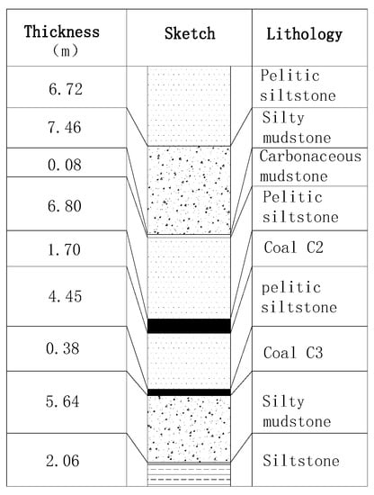 The geological characteristics of the Yuwang No.1 Coal Mine are “one soft, one low, two high, and two complex”: (1) One soft: the coal seam is soft. (2) One low: the coal seam has a low permeability and is difficult to extract. (3) Two high: it has a high gas content and a high gas pressure. (4) Two complex: the geological structure is complex. During the coal mine construction period (including drilling, roadway excavation, chamber excavation, and so on), more than 20 faults with a drop of more than 20 m, more than 210 faults with a drop of more than 2 m, and more than 150 faults with a drop of less than 2 m were found. The system is complex; the well field contains 23 coal seams and 11 recoverable coal seams. The coal seams are mined in groups, and mining has a great influence on each other. At present, the mine intends to adopt a top-down “skinning” mining method which includes mining the C2 coal seam as a protective layer, forming pressure relief protection layer by layer, and comprehensive management of gas in the protective layer through surface drilling and a top (bottom) extraction lane through layer drilling and down-seam drilling.