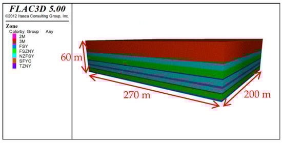 This study analyzes the design of the roof-cutting height and roof-cutting angle of the trackway at the 1,010,201 working face of the Yuwang No.1 Coal Mine with the help of FLAC3D numerical simulation software (version FLAC3D 5.0). First, we established the numerical model of the working face; the lithology and mechanical parameters of the roof and floor of the working face are shown in Table 2 based on the preliminary design of the mine, and the completed 3D model is shown in Figure 4 [,]. The length of the model is 270 m in strike, 200 m in tendency, and 60 m in height. The length of the designed mining face is 200 m, and the width of the retrieval tunnel is 5 m. To avoid the influence of excavation disturbances, 30 m boundaries are left on each side of the retrieval tunnel [,]. Based on the actual engineering conditions of the test working face and the proper simplification of calculations, this research established a three-dimensional calculation model based on the Mohr–Coulomb constitutive model. Constraints are set on the left and right boundary as well as the lower boundary of the model. A vertical stress of 8.6 MPa was loaded on the upper boundary to simulate the self-weight pressure of the overburdened rock above the underground stope [,]. After the original rock stress was loaded and balanced, tunnel excavation and roof-cutting simulations were conducted, and calculations and analysis of stress, strain, and the plastic zone distribution were carried out.
