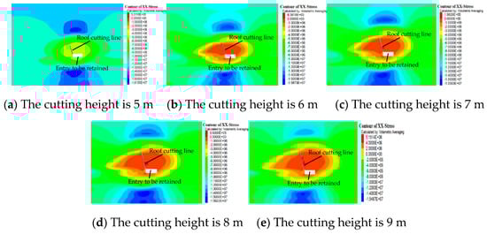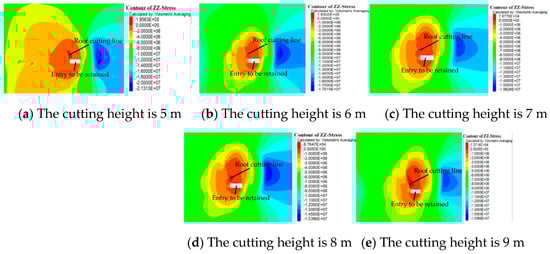 With the help of FLAC 3D numerical simulation software (version FLAC3D 5.0), we simulated the roof-cutting depth of 5 m, 6 m, 7 m, 8 m, and 9 m, respectively, and the simulation and theoretical calculation results were verified with each other to obtain the best cutting height. The vertical stresses in the tunnel surrounding rock under different roof-cutting height conditions are shown in Figure 6.