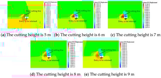 The vertical displacement of the tunnel surrounding rock under different roof-cutting height conditions is shown in Figure 8.