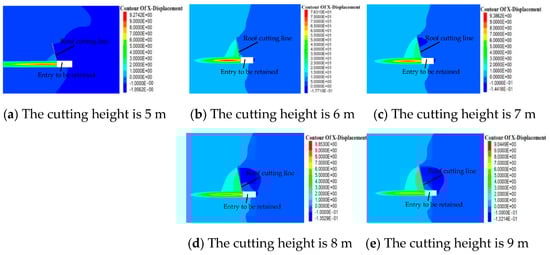 The horizontal displacement of the tunnel surrounding rock under different roof-cutting height conditions is shown in Figure 9.