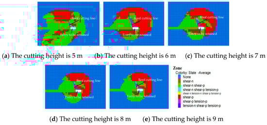 Plastic zone of roadway surrounding rock under different cutting heights.