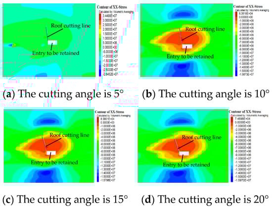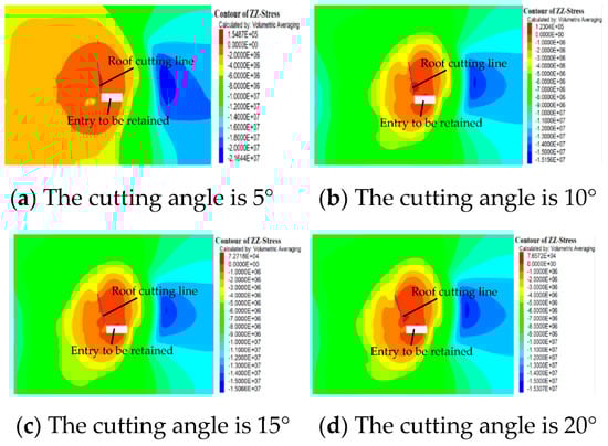 With the help of FLAC3D numerical simulation software (version FLAC3D 5.0), the roof-cutting angles of 5°, 10°, 15°, and 20° were simulated, respectively, and the simulation and theoretical calculation results were verified with each other to obtain the best roof-cutting angle. The vertical stress distributions of the entry surrounding rock under different roof-cutting angle conditions are shown in Figure 11.