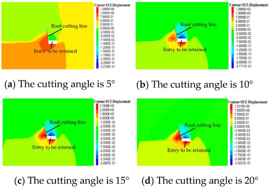 The vertical displacement of the roadway surrounding rock under different roof-cutting angles is shown in Figure 13.