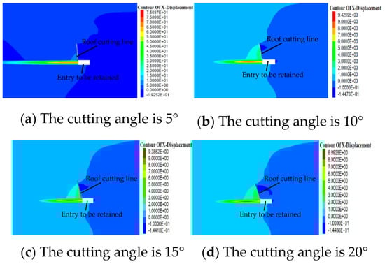 The horizontal displacement of the surrounding rock of the roadway under different roof-cutting angles is shown in Figure 14.