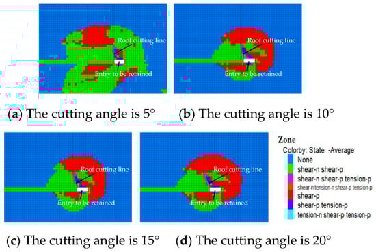 The range of the plastic zone of the surrounding rock of the roadway under different roof-cutting angles is shown in Figure 15.