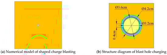 With the help of LS-DYNA numerical simulation software (version LS-DYNA R11.1.0), taking the geological conditions of the 1,010,201 working face in the Yuwang No.1 Coal Mine as the engineering example, a numerical model was established; then, the blast hole spacing of 400 mm, 500 mm, 600 mm, and two blasting modes of multi-hole cumulative blasting and spaced-hole cumulative blasting were simulated and analyzed, respectively. Numerical simulation software was used to analyze and compare the stress evolution process of shaped charge blasting and the crack development process of shaped charge blasting under different blast spacings and different blasting modes. Considering the engineering quantity and the consumption of labor and materials, the best blast hole spacing is 500 mm, and the best blasting method is multi-hole blasting. In the subsequent actual roof-cutting operation, the blast spacing design should be verified on the basis of this result, and the number of holes for one initiation should be further determined.