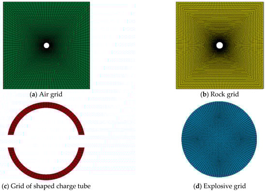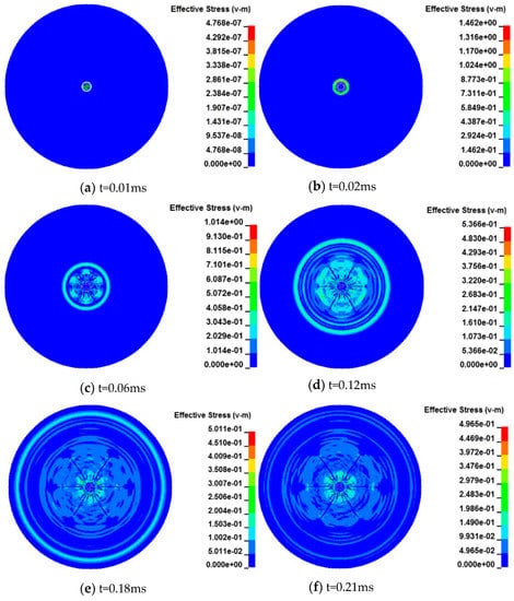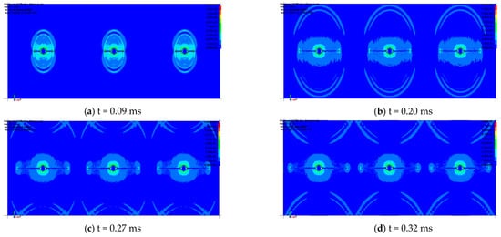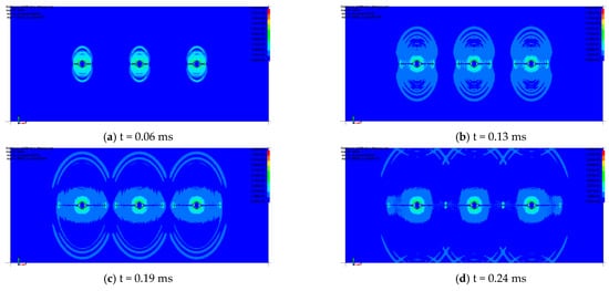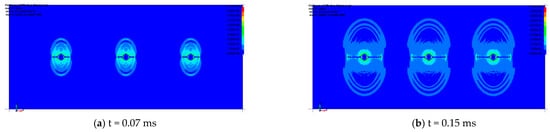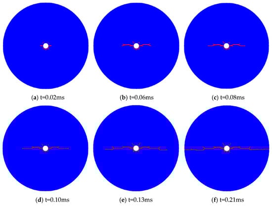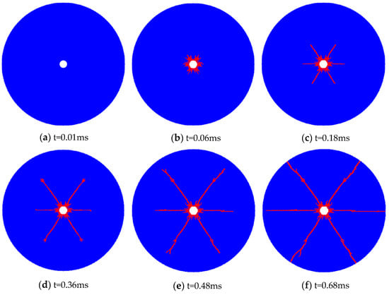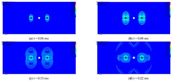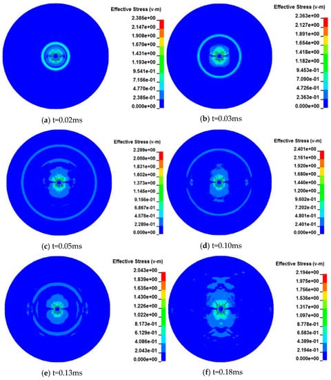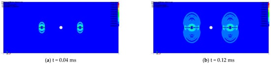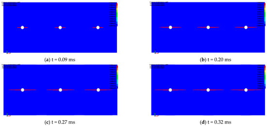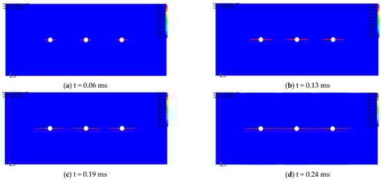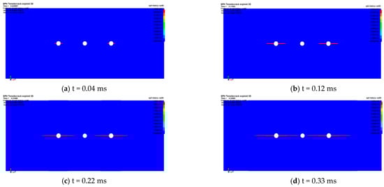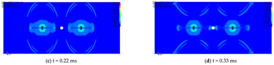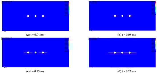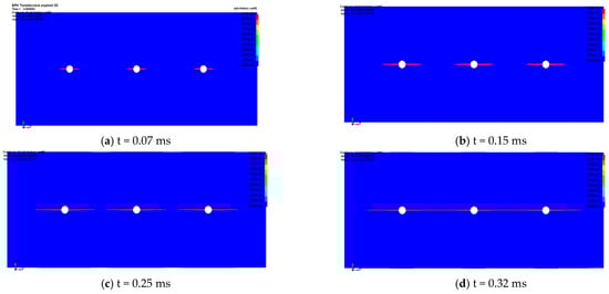 The stress evolution process of multi-hole shaped charge blasting and the development process of blasting cracks are shown in Figure 22, Figure 23, Figure 24, Figure 25, Figure 26 and Figure 27. The instant after the explosive is detonated, a tensile stress concentration zone appears near all shaped charge holes, and the rocks nearby bear the effect of the tensile stress. When the tensile stress exceeds the tensile strength of the surrounding rock, a tensile crack is generated in the surrounding rock near the shaped hole. When the initial tensile crack forms, the surrounding rock cracks along the horizontal single-shaped direction to form six tensile cracks under the action of tensile stress, and the tensile stress concentration is observed at the crack tip perpendicular to the crack surface. With the continuous propagation of the explosive stress wave, the tensile stress zone of the crack tip also moves forward, and the crack tip is constantly destroyed and opened under the effect of the tensile stress, resulting in the continuous propagation of the crack along the direction of the shaped energy. When the spacing between the holes is 400 mm and 500 mm, the tension crack propagates through the adjacent holes. However, when the spacing between the holes is 600 mm, the tension crack generated by the adjacent holes fails to propagate through; then, the adjacent empty holes stop developing and expanding. The reason is that the strength of the explosive stress wave decreases continuously during the propagation process, which affects the tension stress generated by it. When the tensile stress is lower than the tensile strength of the surrounding rock, the tensile cracks will stop growing and expanding. It can be seen that in the case of multi-hole shaped charge blasting, when the hole spacing is 400 mm and 500 mm, the cracks develop and expand along the horizontal ideal shaped charge direction and connect with each other, and a fully connected tension crack is formed between the adjacent holes. Multi-hole shaped charge blasting has a good effect. Considering the cost effectiveness of perforation construction and blasting, the optimal hole spacing is 500 mm.