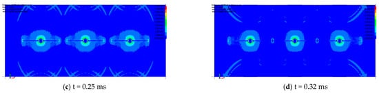 The stress evolution process of spaced-hole shaped charge blasting and the development process of blasting cracks are shown in Figure 28, Figure 29, Figure 30 and Figure 31. The instant after the explosive is detonated, a tensile stress concentration zone appears near all shaped charge holes, and the rocks nearby bear the effect of the tensile stress. When the tensile stress exceeds the tensile strength of the surrounding rock, a tensile crack is generated in the surrounding rock near the shaped hole. When the initial tensile crack forms, the surrounding rock cracks along the horizontal single-shaped direction to form four tensile cracks under the action of the tensile stress, and the tensile stress concentration is observed at the crack tip perpendicular to the crack surface. With the continuous propagation of the explosive stress wave, the tensile stress zone at the crack tip also moves forward. The crack tip is constantly destroyed and opened under the effect of the tensile stress, resulting in the continuous expansion of the crack along the direction of the shaped energy. When the hole spacing is 200 mm, the tension crack propagates through the adjacent empty holes. When the hole spacing is 300 mm, the tension crack generated by the adjacent holes fails to propagate through; then, the adjacent empty holes stop developing and expanding. The reason is that the strength of the explosive stress wave decreases continuously during the propagation process, which affects the tension stress generated by it, and when the tensile stress is lower than the tensile strength of the surrounding rock, the tensile crack stops developing and spreading. It can be seen that in the case of spaced-hole shaped charge blasting, when the hole spacing is 200 mm, the cracks develop and expand along the horizontal ideal shaped charge direction and run through the adjacent empty holes. A fully connected tension crack is formed between the blasting hole and the empty holes. The effect of spaced-hole shaped charge blasting is good, but a large number of empty holes need to be constructed, which greatly affects the cost effectiveness of the hole construction and blasting. At the same time, the setting of empty blast holes does not play an optimal role in promoting the surrounding rock stress evolution and crack development of shaped charge blasting. Therefore, the optimal blasting method is the multi-hole shaped charge blasting with a hole spacing of 500 mm.