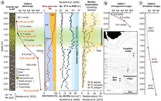 Figure 2. Contrasting sedimentary environments on the continental shelf off the Guadiana River. (a) Core 5 (middle shelf mud belt). (b) Core 7 (proximal zone of a transgressive sandy deposit). (c) Core 8 (inner shelf prodeltaic wedge). Age models based on calibrated ages and sedimentation rates are included (adapted from Mendes et al. [29]). In (a), bottom-up variation in size fractions and mean grain size [29], δ13C and OC/TN concentrations (<63 μm fraction of carbonate-free samples; [47]), and relative abundance (%) of benthic foraminiferal species associated with upwelling conditions [55] are also indicated. The glauconitization process is highlighted.
