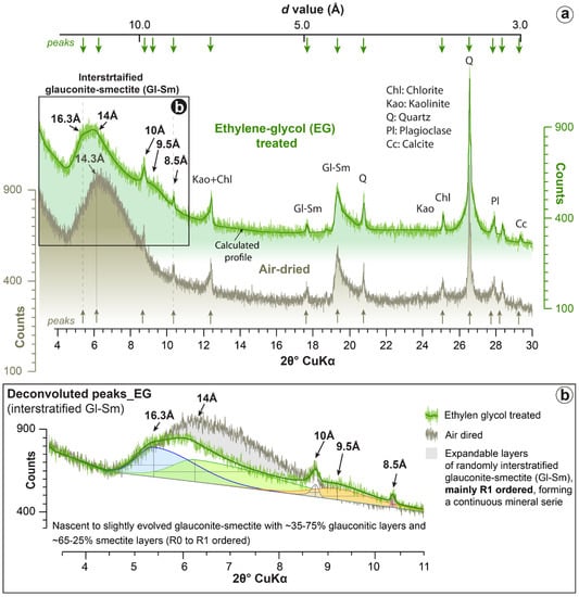 Deconvoluted peaks indicate that the glauconite contains expandable smectite layers. According to Moore and Reynolds [61], the XRD patterns may be interpreted as a distinctive poorly mature glauconite-smectite (mostly R1 ordered) mixed-layer phyllosilicate. The higher-order peaks of the mixed layers, which are diagnostic for the % of smectitic layers, comprise a wide band showing a continuum, rather than individual peaks, with a range of spacings roughly equivalent to 35–75% illite layers and 65–25% of interstratified smectite layers (Figure 5b). The extension of the first order peak up to the 16.3Å region is interpreted as indicating a minor component of R0-ordered glauconite-smectite. Overall, the wide range of interstratifications of glaucony corresponds to the different stages of maturation from nascent (most immature) to evolved (Figure 5b).