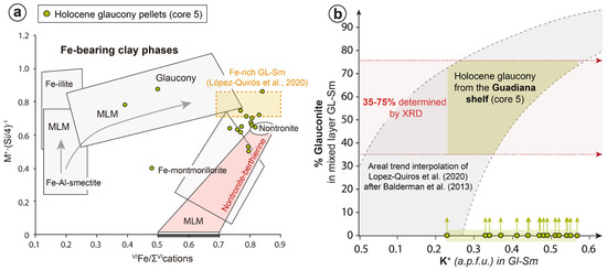 Figure 7. (a) Projection of glaucony pellets (core 5) in the M+(Si/4)−1 vs. VIFe/ΣVI cations cross-plot (i.e., the Fe-bearing clay phases diagram of Meunier and El Albani [18]), representing the path of the glauconitization process from a nontronite-berthierine precursor. MLM: Mixed-layer minerals. (b) Relationship between % glauconite and interlayer K+ (a.p.f.u.) content in the interstratified glauconite-smectite (Gl-Sm) mixed layers from core 5. Note that expandable layers (% glauconite ~35–75 ± 5) are determined by XRD, while interlayer K+ (a.p.f.u.) content is from results of AEM (Table 2). Results are plotted against the calculated areal trend interpolation of López-Quirós et al. [62] after Baldermann et al. [13], based on values from different glaucony-bearing sequences.