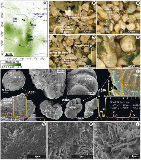 Figure 8. (a) Distribution map of glaucony-forming grains on the Guadiana shelf (from Gonzalez et al. [27]), with location of selected surface samples (A854, A853, A852, A851, A850, A849, and A848) from exposed transgressive deposits (i.e., the transgressive bulge). The location of core 5 in the vicinity of the mud belt is shown for comparison. (be), Digital photomicrographs showing the >63 µm size fraction of the glaucony-bearing muddy to sandy surface sediments. Glaucony occurs mainly as pale olive to green biogenic (benthic foraminifera) casts and internal moulds, retaining the shape of the original biogenic test. Other terrigenous components and microfossils such as non-glauconitized foraminifera are present. (f) SEM photomicrographs (SE) of sieved/purified glauconitic foraminiferal tests (casts/internal moulds) displaying smooth surfaces. Corresponding energy dispersive X-ray (EDX) analysis of each glauconitic test is shown. Furthermore, EDX analysis of foraminifera shells are also shown. (gi), SEM photomicrographs (SE) showing moderate packing density lamellar-flaky nanostructure of glauconitic foraminiferal tests.