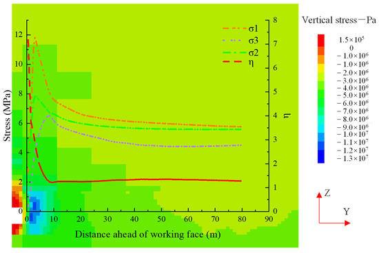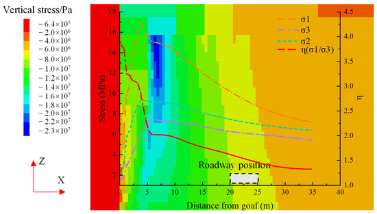 2.3. Regional Stress Distribution Law of Mining Roadway