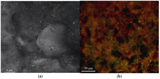 Biofilm formation on the zeolite was proved using a laser confocal scanning microscope (Leica SP5, Berlin, Germany). Polysaccharide matrix was stained with lectin IV from wheat germ agglutinin (WGA, Sigma-Aldrich, Darmstadt, Germany) conjugated with fluorescent dye Alexa Fluor 488 (W11261 ThermoFisher, Waltham, MA, USA). For cell visualization, fluorescent dye SYTO® 11 (S7573 ThermoFisher, Waltham, MA, USA) diluted 1:1000 in phosphate buffer (Sigma-Aldrich, Darmstadt, Germany) was applied. The Imaris software package (Version 7.0.0, Bitplane, Zurich, Switzerland) was applied to determine the area occupied by bacterial cells and polysaccharide matrix.