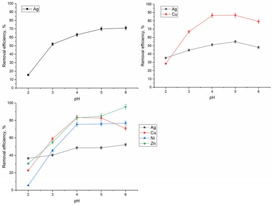 Influence of pH on silver, copper, nickel and zinc removal from studied synthetic solutions by bio-zeolite (time: 1 h, temperature: 20 °C, pH: 2.0–6.0, Ci,Ag: 10 mg/L, Ci,Cu: 5 mg/L, Ci,Ni, Zn: 2 mg/L).