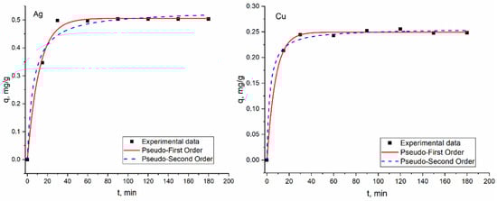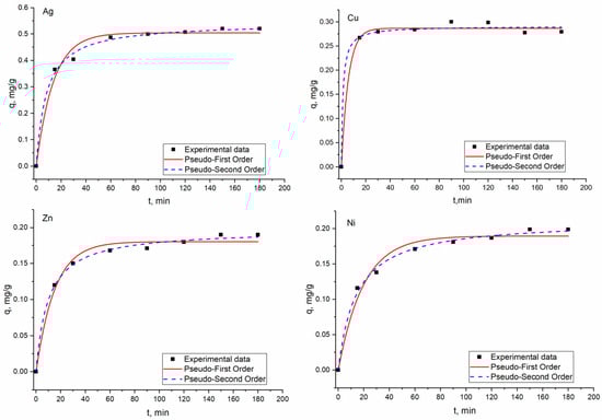 In the binary (Ag-Cu) system, 77% of Cu were removed from the solution in 60 min of sorbent–sorbate interaction, while in the quaternary system, 83% of copper ions were removed in 150 min. The maximum removal of zinc and nickel ions was attained in 150 min, when 95% of zinc and 100% of nickel ions were removed from the solution. The process of metal sorption took place in two stages: fast sorption, followed by a slow stage with equilibrium achievement. A drastic increase of metal ions sorption at the first stage is explained by the large number of the vacant sites of the bio-zeolite surface. Lowering the sorption in the next stage is mainly due to saturation of the binding sites and attainment of equilibrium [,]. Fast adsorption at the first stage can be also explained by metal ions trapping to the exterior surface, while the metal ions’ entrance into the pores (interior surface) is a relatively slow process [].