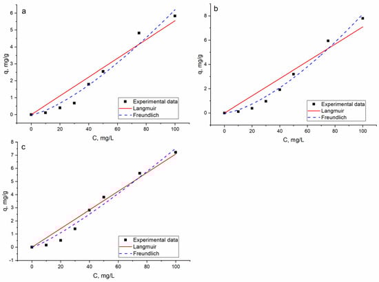 Langmuir and Freundlich isotherms generally used to fit equilibrium adsorption data are expressed by Equations (6) and (7). The Langmuir model assumes a monolayer coverage of adsorbate on the homogeneous surface, while applicable to adsorption processes that occur on heterogonous surfaces [].
