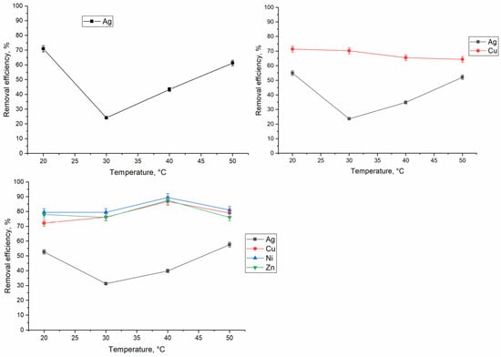 The temperature of the solution influenced the process of metal ions removal from analysed systems (Figure 7). Thus, in the Ag-system, a rise of temperature from 20 to 30 °C led to the decrease of bio-zeolite sorption capacity from 71 to 24%, then silver removal increased up to 61% with a temperature increase up to 50 °C (Figure 7). The same pattern was observed in the Ag-Cu system: silver removal firstly decreased with a temperature increase to 30 °C, then it rose with the temperature growing and reached the value of 52% at 50 °C (it was very close to the removal capacity of 54% at 20 °C). Copper removal continuously decreased with the increase of temperature. In the Ag-Cu-Ni-Zn system, the behaviour of silver removal was similar to previously described systems, while removal of copper, nickel and zinc firstly increased up to a temperature of 40 °C and then was slightly reduced.