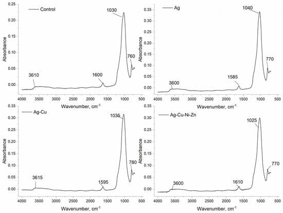 FTIR spectra were recorded in order to reveal involvement of functional groups of bio-zeolite in metals ions binding. According to Figure 8, in the control bio-zeolite, the bands at 760 and 1030 cm−1 attributed to O-Si-O and Si-O-Al groups were present []. Bands at 3610 cm−1 and deformation at area 1600 cm−1 are characteristic of -OH groups. In Ag-loaded biosorbent, the shift of identified groups by 10/15 cm−1 points at their involvement in silver ions removal. In the case of the Ag-Cu system, shifting of the band positions of Si-O- and -Si-O-Si- groups by 5/20 cm-1 and of -OH group by 5/7 cm−1 showed their involvement in silver and copper ions removal. In the multi-metal system, the shift of the bands of -Si-O- and -OH groups was observed. As possible mechanisms of metal ions sorption, one can regard the formation of bi- and mono-dentate ligands of metal ions with -OH groups and subsequent strong electrostatic interaction with a charged bio-zeolite surface [].