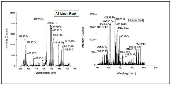 In the case of Sample A2 (Mars rock), the characteristic iron lines were observed at 422.78 nm, 430.90 nm and 396.87 nm, and the decisive lines of oxygen were observed at 430.28 nm and 404.61 nm. The magnesium line can be observed at 442.31 nm. In addition, aluminium line was observed at 394.47 nm and 393.35 nm. In addition to these, lines corresponding to the minor components were observed at 526.55 nm and 445.47 nm for calcium and at 438.41 nm for sodium. However, there was no line indicative of the presence of potassium.