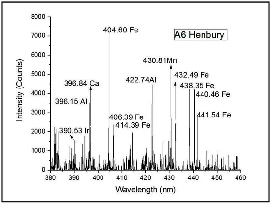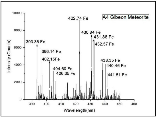 Sample A8 is another stony achondritic meteorite and comes under the subclass of HED meteorites. HED stands for howardite–eucrite–diogenite, and these came from a differentiated parent body and underwent igneous processing such as magmatic rocks found on Earth, and for this reason, they closely resemble terrestrial igneous rocks. Sample A8 (Eucrite MMICT) showed the strong presence of iron at 422.63 nm, 422.78 nm, 429.96 nm, 431.88 nm, 432.59 nm, 445.80 nm, 396.87 nm and so on [28]. Lines of calcium were identified at 396.84 nm, 428.30 nm and 430.25 nm. The presence of aluminium, another major component, can be confirmed from the line at 396.15 nm. The minor component manganese has been identified at 430.81 nm and 445.82 nm, while the presence of lithium can be seen at emission with wavelength of 413.25 nm.