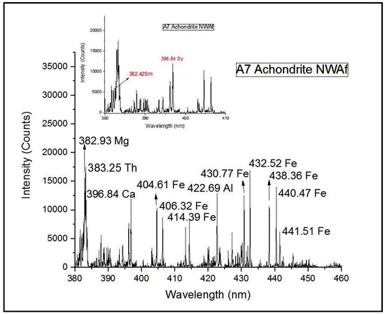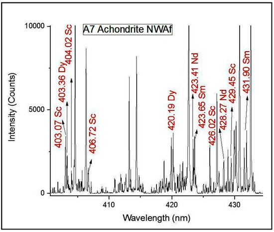 Sample A7 comes under the class of achondrites which is another stony meteorite like the chondrites but does not contain the chondrule structures present in the chondrites. Here again, unlike the iron meteorites, other elements are expected along with iron, with iron being a major constituent. For Sample A7 (Achondrite NWAf), the characteristic iron lines can be observed at 404.61 nm, 432.52 nm, 438.36 nm, 440.47 nm, 441.51 nm and so on. In addition, a strong aluminium line is observed at 422.69 nm. In addition to these, lines corresponding to the minor components were observed at 396.84 and 431.89 nm for calcium. A closer investigation for more emission from rare Earths from among the less intense lines, revealed the presence of samarium and dysprosium corresponding to the emission lines at 382.42 nm and 396.84 nm, respectively.