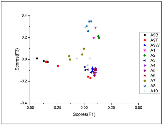 Usually, pre-processing of the data is required before carrying out PCA. On the LIBS spectral data, no pre-processing except data interpolation was carried out. Four spectra were recorded from each sample except Samples 1 and 2, on which only two spectra could be recorded due to their smaller size. Twelve spectra were recorded from three different areas—the light, dark and transparent regions—(four spectra from each) of Sample 9. Thus, there were a total of 44 spectra in the complete dataset. Full range spectra of all 44 samples were used for PCA with the intent of possible clustering in coherence with the elemental information obtained from LIBS analysis. PCA results showing scores of Principal Component 1 (PC1 i.e., F1) versus those of Principal Component 2 (PC2 i.e., F2) are shown in Figure 13.