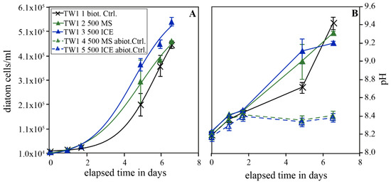 Temporal evolution of diatom concentration (A) and pH (B) during experimental series TW1 carried out Instant Ocean enriched with pure Guillard’s f/2 culture medium. The error bars represent the standard deviation of the triplicate experiments.