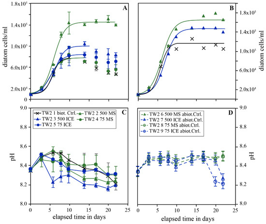 Temporal evolution of diatom concentration (A,B) and pH (C,D) in experimental series TW2 carried out in Instant Ocean© enriched with 5% Guillard’s f/2 culture medium. Figure (A) shows the evolution of diatom concentrations in experiments performed in 250 mL reactors, whereas Figure (B) shows the evolution in experiments performed in 500 mL reactors. Figure (C) shows the pH evolution of the biotic experiments and Figure (D) the pH evolution of the abiotic experiments. The error bars in A represent the standard deviation of the duplicate experiments in (C,D) of triplicate experiments. The uncertainty in diatom concentrations in Figure (C) is estimated to be below 10%.