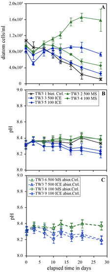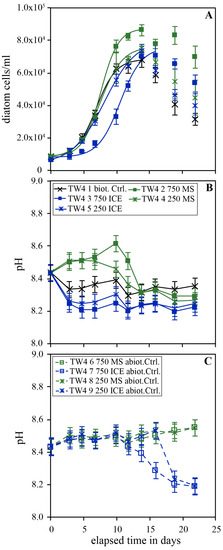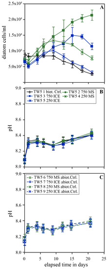 Temporal evolution of diatom concentration (A), pH (B) during the biotic experiments and pH during the abiotic control (C) experiments of series TW4. The error bars represent the standard deviation of triplicate experiments.