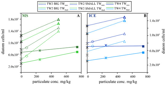 Measured maximum (TWmax) and final (TWfinal) diatom concentrations as a function of MS (A) and ICE (B) riverine particulate concentration for experimental series TW2 and TW4 performed in Instant Ocean enriched with 5% Guillard’s f/2 culture medium. BIG and SMALL refer to the 500 mL and 250 mL reactors used in series TW2. Biotic controls without particulates are indicated as black crosses on the y-axes. Increasing particulate concentration raised diatom concentrations compared to the biotic control without particulates.
