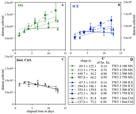 Temporal evolution of diatom concentration during the first 13 days of experimental series TW3 and TW5, performed in Instant Ocean without additional nutrient enrichment. Panels (A,B) show the results from experiments performed in the presence of MS and ICE particulates while panel (C) shows the results of the biotic controls without particulates. The lines show the best linear fits of the data, while the slopes of these fits are shown in the box at the bottom right (D). The presence of ≥100 mg/kg of particulates caused a linear growth of diatom, whereas their abundance decreased over time in the biotic controls without particulates.