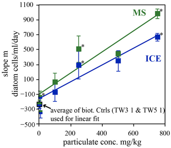 The linear growth observed during the experiments containing ≥100 mg/kg particulates is highlighted in Figure 9, which shows the slope of the best linear fits given in Figure 8 as a function of MS and ICE particulate concentrations added to the reactors. As a first approximation, these data are linear functions of particulate concentration, and consistent with rates of 1.42 ± 0.31 (R2 = 0.87) and 1.13 ± 0.18 (R2 = 0.92) diatom cells/mL/day per mg/kg in the presence of MS and ICE particulate material, respectively. With a diatom (TW) cell organic carbon content of about 30–180 pg C/cell [44,84,88], this corresponds to organic carbon formation rates ranging from 43 ± 9 to 255 ± 57 and 34 ± 6 to 203 ± 33 pg C/mL/day per each mg/kg MS and ICE particulate material, respectively. This estimate only takes into account cellular organic carbon and thus excludes extracellular Corg, which may significantly contribute to the total organic carbon content. Similar to the experiments performed in nutrient-enriched Instant Ocean©, MS particulates showed a greater effect on diatom growth than ICE particulates.