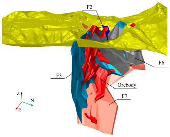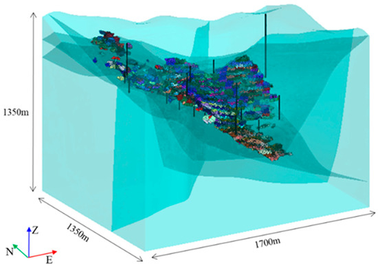 To estimate the shaft stability and surface deformation induced by underground mining transferred from open-pit mining precisely, the model scope is appropriately expanded from the mining area to reduce the influence of boundary effect. Finer meshing was assigned to the research domain where the shafts, faults, surface, and orebody are located. Finally, a three-dimensional numerical model was established with a length of 1700 m (WE), a width of 1350 m (NS), and an average height of 1000 m, including a total of 3.6 million zones and 2 million nodes. The three-dimensional model is shown in Figure 9.
