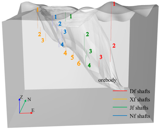 For the underground mining, nine levels of 490 m, 430 m, 370 m, 310 m, 250 m, 205 m, 150 m, 90 m, and 30 m are set above 30 m level. The deep orebody between 30 m and −240 m has a smaller strike length compared with the upper orebody, which will be mined in the next mining scheme (Figure 3). The intake shafts located in the center and the returned shafts are on the ends of the ore body. The shaft system consists of four groups of shafts: Df shafts, Xf shafts, Jf shafts, and Nf shafts. Each group of shafts is composed of open shaft and staple shafts. The positions of shafts are shown in Figure 4, and the information is shown in Table 1.