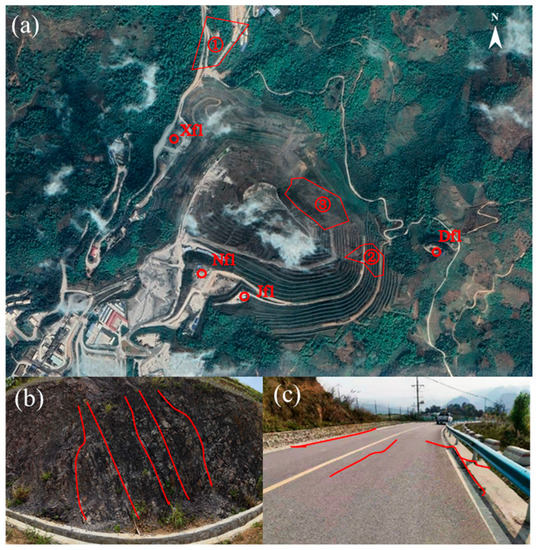 Surface damage on the open-pit and road (a) Surface damage areas and shafts location; (b) Cracks on the east slope (②area); (c) Cracks on the road (① area).