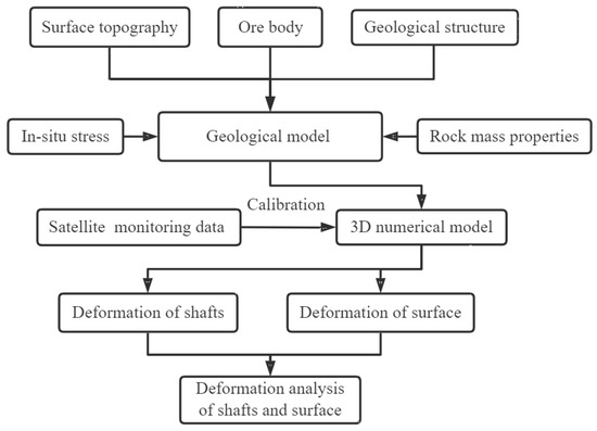 Plenty studies have been carried out on shaft stability and surface deformation induced by underground mining transferred from open-pit mining. The conventional methods include the empirical method, analytical method, physical modeling, and numerical modeling [6]. In the empirical method, researchers need to collect plenty of data from field observation and measurements and build empirical equations or graphs to analyze and predict shaft stability and surface deformation. Nonetheless, the empirical method is site-dependent, and which can only be applied to similar projects [7,8]. Most of the analytical methods are based on some simplifications and idealize the rock strata as beam or slab, which is then analyzed with certain mechanical analysis methods. However, there are only a few analytical methods due to the complexity, and simplification will lead to the inaccurate estimation of shaft stability and surface deformation, especially in the cases with complex surface topography and geological structures [9]. The physical modeling method requires to construct an isometric solid model made of gypsum or other materials, and it is difficult to simulate the three-dimensional geological body with complex surface, slopes, and geological structures, and it also costs a lot of money and time [10].