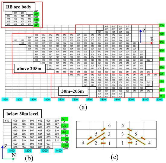 Stopes distribution and mining sequence in the same level (a) Stopes distribution above 30 m levels; (b) Stopes distribution blow 30 m levels; (c) Mining sequence in the same level.