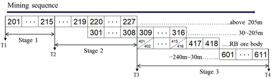 In the model, the heights of mining level and sublevel are respectively 60 m and 20 m. In general, the underground mining is divided into four parts. In the first part, ore bodies above 205 m were extracted. Ore bodies between 205 m and 30 m were extracted in the second part. In the next part, the western RB ore body near the surface was excavated. A deep ore body from 30 m to −250 m level was finally extracted. The mining of each part is carried out successively, and one step was delayed from bottom to top in levels of the same part. The excavated stopes in the same level were triangle distributed, and exploitation was carried out from the middle to both sides of the ore body. The simulated underground mining procedure was divided into 50 steps, with a total of 350 stopes. The distribution and excavation sequence of stopes are shown in Figure 10 and Figure 11.