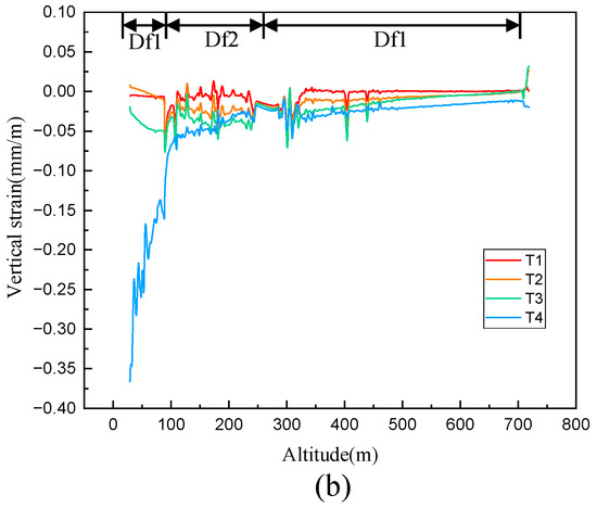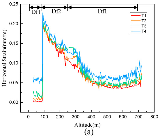 The Df shafts’ horizontal strains at four moments during the simulation is shown in Figure 13a. Horizontal strains of the upper two shafts (Df1 and Df2) gradually raises with the increase of depth (decrease of altitude), and the horizontal strains of the lowest shaft (Df3) are smaller. The main reason for this is that the Df1 is located at the hanging wall though far away from the ore body, and Df2 is located at the end of the ore body but close to it, so they are affected by the underground mining activity. Besides, Df3 is short and located oblique below the ore body, so it is much less affected.