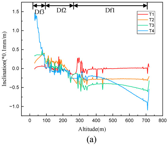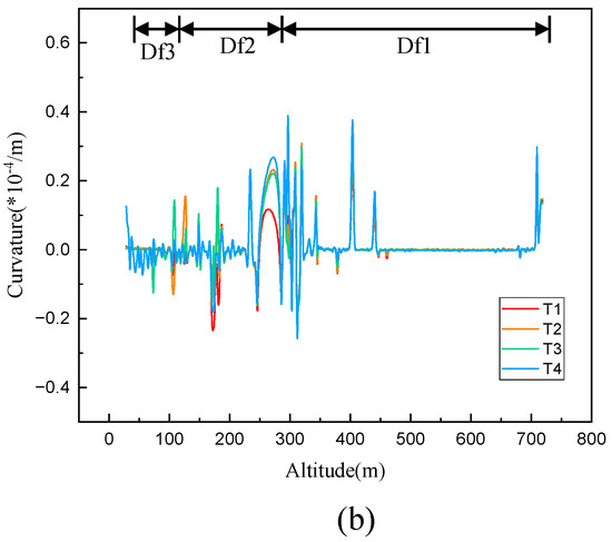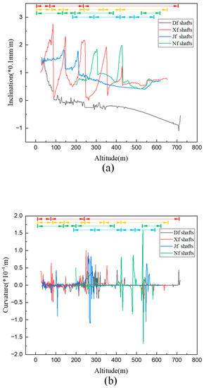 Figure 16b shows the curvatures of shafts. The curvatures of Df2 and Df3 are larger and more variable than Df1. The Xf shafts and Jf shafts also have larger curvatures at the end of each shaft, and the Nf shafts have large curvatures at the ends and in the middle of individual shafts. In general, the curvatures of the four groups of shafts are small, and there are only relatively large values at some points, which is no more than 2 × 10−4/m.