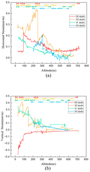 The final horizontal strains of the four groups of shafts are shown in Figure 15a. Generally, the horizontal strains of shafts rise with the depth increasing. In particular, Df3, the lowest section of Df shafts, has lower horizontal strains due to it is short and located oblique below the ore body. Four lower shafts of the Xf shafts (Xf3, Xf4, Xf5 and Xf6) and the Nf4 are closer to the ore body and located at the footwall, so in a certain shaft above, with the depth rises, farther away from the ore body, the horizontal strains decrease. Jf1 is close to the open-pit slope (less than 20 m at the nearest position), where the shaft is closer to the surface, and the horizontal strains show an increasing trend. In general, the final horizontal strain of the four groups of shafts is less than 0.5 × 10−3.
