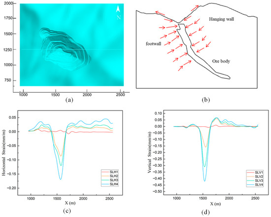 Take points continuously on the line y = 1250 on the surface as shown in Figure 17a, and then calculate the horizontal and vertical strains, as shown in Figure 17c,d. Here, x < 1600 is in the west, located at the footwall of the ore body, and x > 1600 is in the east, located at the hanging wall. The maximum strains appear at the bottom of the pit and increase with the mining procedure. Finally, the maximum horizontal strain at the bottom of the open-pit is approximately –0.18 × 10−3, and the maximum vertical strain is –0.48 × 10−3.