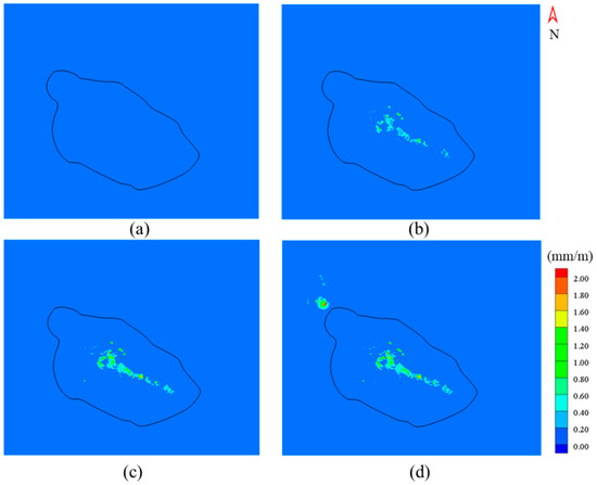 Surface horizontal strain (a) moment 1; (b) moment 2; (c) moment 3; (d) moment 4.