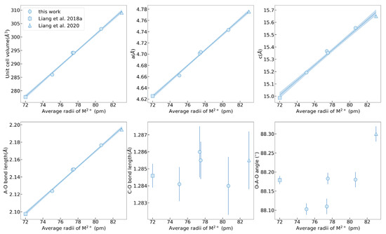 Figure 1. The single crystal lattice parameters of MFM, MF, FM, and MM compared with literature data of MgCO3 and MnCO3 with the change of the average ion radii. Data from Liang et al., 2018a, and Liang et al., 2020 [19,24].