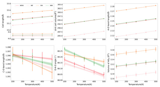 The variations of the lattice parameters of MFM, MF, FM, and MM at 100–500 K are shown in Figure 2. The lattice parameters, including a, c, unit cell volume V, A–O bond length, and AO6 octahedral volume, increase as the temperatures rise, and instead, the C–O bond lengths and O–A–O bond angles decrease. It reveals that the octahedron of AO6 expands during the process of thermal expansion, resulting in the extrusion of adjacent [CO3]2− groups and the shortening of the C–O bond length. The decrease of the O–A–O bond angle with temperature indicates that the (AO6) octahedron becomes more tilted with lattice expansion. The thermal expansion coefficient α is defined as α = 1/V(∂V/∂T)P = α0 + α1T + α2T2 + …, and here only α0 is reserved to describe the linear variations of volume or length with temperature when the temperature is not very high; that is, V = V300(1 + α0(T − 300)) and the V300 is volume or length at 300 K. The thermal expansion coefficients of MFM, MF, FM, MM, MgCO3, and MnCO3 with the average ion radius are listed in Table 1 [24,28]. The cation substitution of Fe2+ and Mn2+ mainly affects the thermal expansion coefficient by changing the bond length in the octahedral configuration. Therefore, the bond length expansion coefficient αA–O is regarded as a value inversely proportional to the A–O bond length. In general, the bond-length expansion coefficient αA–O has a tendency to decrease with the substitution of cations with a larger radius. However, the Fe- and Mn-bearing samples (MFM and FM) exhibit an abnormally high value of the bond-length expansion coefficient αA–O. The anomaly also suggests that the simultaneous substitution of Fe2+ and Mn2+ affects their thermal expansion properties. Given that the rigid [CO3]2− groups on the ab plane have an obvious influence on the anisotropy, the thermal expansion along the c-axis in our samples is approximately 2.95–3.55 times greater than that along the a-axis. An approximate relationship of αV ≈ 2αa + αc is observed and is consistent with the inherent calcite-type crystal structure.