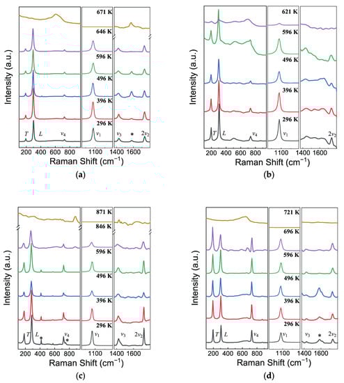 Figure 3. Representative Raman spectra of (a) MFM, (b) MF, (c) FM, and (d) MM at high temperature. The asterisks (*) symbolize the unassigned Raman peaks.