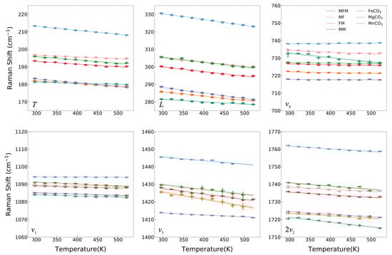 Figure 4. Raman shifts of MFM, MF, FM, MM, FeCO3, MgCO3, and MnCO3 of each mode as a function of temperature can be modeled via a linear fit from 296 K to 521 K.